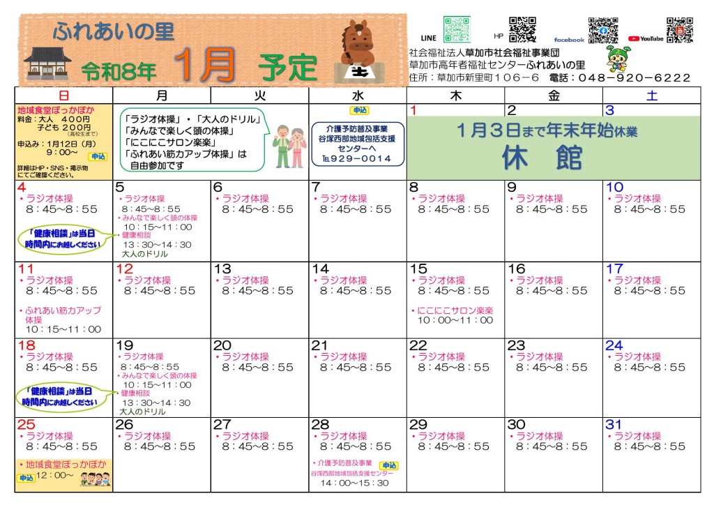 NEWS であいの森・ふれあいの里 1月予定のご案内 2025年12月26日 であいの森・ふれあいの里 1月の予定表を掲載いたします。 みなさまのご来館、心よりお待ちしております♪ 【であいの森】R8.1月予定表ダウンロード 【ふれあいの里】R8.1月予定表ダウンロード ※日程変更や中止の場合もございます。 〇お問合せ先 ・草加市総合福祉センターであいの森 住 所:草加市柿木町261番地1 地図はこちら 電 話:048-936-2791 ・草加市高年者福祉センターふれあいの里 住 所:草加市新里町106番地6 地図はこちら 電 話:048-920-6222 NEWSトップに戻る