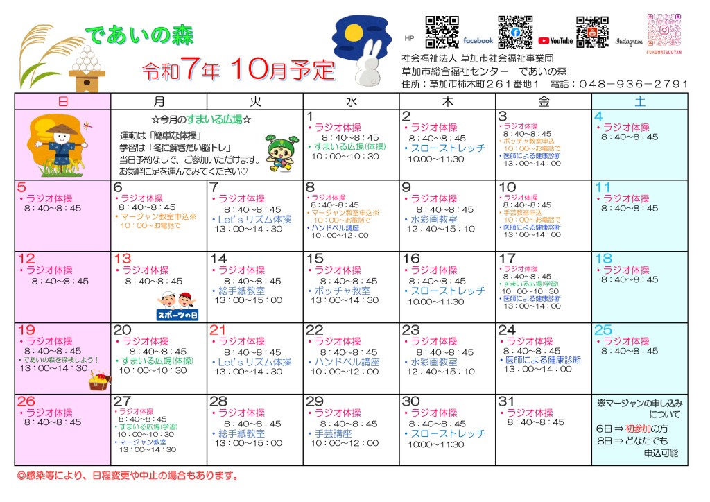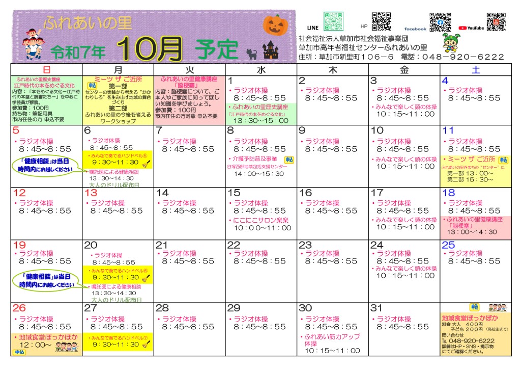 NEWS であいの森・ふれあいの里 10月予定のご案内 2025年9月30日 であいの森・ふれあいの里 10月の予定表を掲載いたします。 みなさまのご来館、心よりお待ちしております♪ 【であいの森】R7.10月予定表ダウンロード 【ふれあいの里】R7.10月予定表ダウンロード ※日程変更や中止の場合もございます。 〇お問合せ先 ・草加市総合福祉センターであいの森 住 所:草加市柿木町261番地1 地図はこちら 電 話:048-936-2791 ・草加市高年者福祉センターふれあいの里 住 所:草加市新里町106番地6 地図はこちら 電 話:048-920-6222 NEWSトップに戻る
